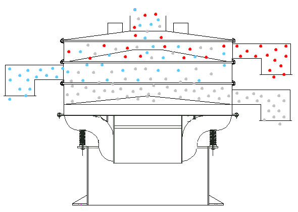物料從機器的中間給料,物料在篩網(wǎng)上的運動距離基本相同,可以保證非常精確的篩分過程。旋振篩的徑向角使得物料在篩網(wǎng)上呈漸開線運動,其設(shè)計使得物料能在較小的面積上走過相對長的路,物料的著網(wǎng)時間比其他類型的篩子時間要長。調(diào)整徑向角和切向角可以調(diào)整篩分的精度和產(chǎn)量。